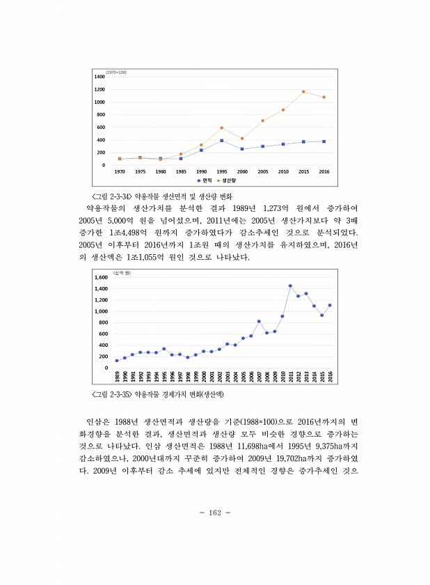 162 그림 2-3-34 약용작물 생산면적 및 생산량 변화 약용작물의 생산가치를 분석한 결과 1989년 1,273억 원에서 증가하여 2005년 5,000억 원을 넘어섰으며, 2011년에는 2005년 생산가치보다 약 3배 증가한 1조4,498억 원까지 증가하였다가 감소추세인 것으로 분석되었다. 2005년 이후부터 2016년까지 1조원 때의 생산가치를 유지하였으며, 2016년 의 생산액은 1조1,055억 원인 것으로 나타났다. 그림 2-3-35 약용작물 경제가치 변화 생산액 인삼은 1988년 생산면적과 생산량을 기준 1988=100 으로 2016년까지의 변 화경향을 분석한 결과, 생산면적과 생산량 모두 비슷한 경향으로 증가하는 것으로 나타났다. 인삼 생산면적은 1988년 11,698ha에서 1995년 9,375...