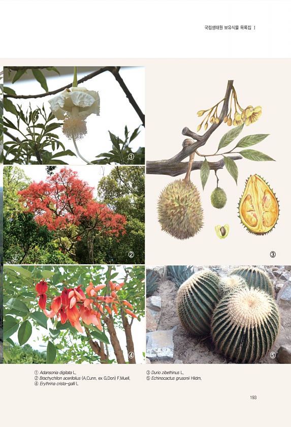 193 국립생태원 보유식물 목록집 Ⅰ ① ② ③ ④ ⑤ ① Adansonia digitata L. ② Brachychiton acerifolius A.Cunn. ex G.Don F.Muell. ④ Erythrina crista-galli L ③ Durio zibethinus L. ⑤ Echinocactus grusoniiHildm.