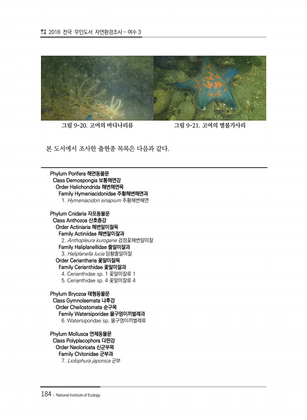 2018 전국 무인도서 자연환경조사 여수 3 184 ? National Institute of Ecology 본 도서에서 조사한 출현종 목록은 다음과 같다. 그림 9-20. 고여의 바다나리류 그림 9-21. 고여의 별불가사리 Phylum Porifera 해면동물문 Class Demospongia 보통해면강 Order Halichondrida 해변해면목 Family Hymeniacidonidae 주황해변해면과 1. Hymeniacidon sinapium 주황해변해면 Phylum Cnidaria 자포동물문 Class Anthozoa 산호충강 Order Actiniaria 해변말미잘목 Family Actiniidae 해변말미잘과 2. Anthopleura kurogane 검정꽃해변말미잘 Family Halipla...