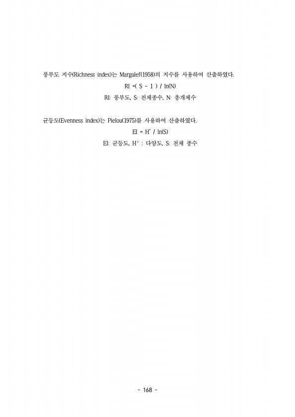 168 풍부도 지수 Richness index Margalef 1958 는 의 지수를 사용하여 산출하였다. RI = S 1 ln N RI, S, N풍부도 전체종수 총개체수 균등도 Evenness index Pielou 1975 는 를 사용하여 산출하였다. EI = Hln S EI, H , S균등도 다양도 전체 종수′