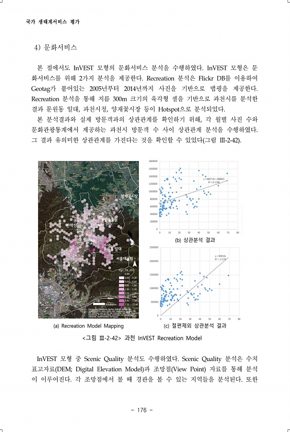 국가 생태계서비스 평가 176 4 문화서비스 본 절에서도 InVEST 모형의 문화서비스 분석을 수행하였다. InVEST 모형은 문 화서비스를 위해 2가지 분석을 제공한다. Recreation 분석은 Flickr DB를 이용하여 Geotag가 붙어있는 2005년부터 2014년까지 사진을 기반으로 맵핑을 제공한다. Recreation 분석을 통해 지름 300m 크기의 육각형 셀을 기반으로 과천시를 분석한 결과 문원동 일대, 과천시청, 양재꽃시장 등이 Hotspot으로 분석되었다. 본 분석결과와 실제 방문객과의 상관관계를 확인하기 위해, 각 월별 사진 수와 문화관광통계에서 제공하는 과천시 방문객 수 사이 상관관계 분석을 수행하였다. 그 결과 유의미한 상관관계를 가진다는 것을 확인할 수 있었다 그림 Ⅲ-2-42 b...
