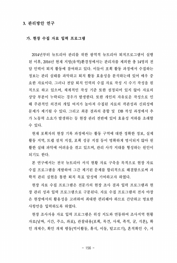 3. 관리방안 연구 가. 현장 수집 자료 입력 프로그램 2014년부터 뉴트리아 관리를 위한 광역적 뉴트리아 퇴치프로그램이 실행 된 이후, 2016년 현재 지방 유역 환경청에서는 관리자를 제외한 총 14명의 전 담 인력이 퇴치 활동에 참여하고 있다. 이들이 포획 활동 과정에서 수집하는 정보는 관리 실태를 파악하고 퇴치 활동 효율성을 분석하는데 있어 매우 중 요한 자료이다. 그러나 전담 퇴치 인력의 수집 자료 작성 시 수기 작성을 원 칙으로 하고 있으며, 체계적인 작성 기준 또한 설정되어 있지 않아 자료의 상당 부분이 누락되는 경우가 발생한다. 또한 개인의 자유로운 작성으로 인 해 주관적인 의견의 개입 여지가 높아져 수집된 자료의 객관성과 신뢰성에 문제가 제기될 수 있다. 그리고 최종 결과의 종합 및 DB 작성...