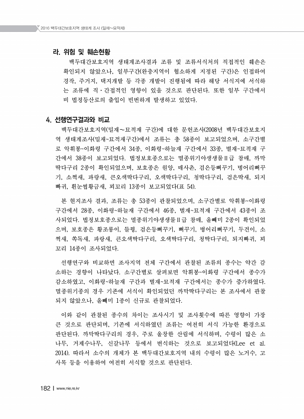 2016 백두대간보호지역 생태계 조사 밀재묘적재 182Ⅰwww.nie.re.kr 라. 위험 및 훼손현황 백두대간보호지역 생태계조사결과 조류 및 조류서식처의 직접적인 훼손은 확인되지 않았으나, 일부구간 완충지역이 협소하게 지정된 구간 은 인접하여 경작, 주거지, 택지개발 등 각종 개발이 진행됨에 따라 해당 서식지에 서식하 는 조류에 직·간접적인 영향이 있을 것으로 판단된다. 또한 일부 구간에서 비 법정등산로의 출입이 빈번하게 발생하고 있었다. 4. 선행연구결과와 비교 백두대간보호지역 밀재∼묘적재 구간 에 대한 문헌조사 2008년 백두대간보호지 역 생태계조사 밀재묘적재구간 에서 조류는 총 58종이 보고되었으며, 소구간별 로 악휘봉이화령 구간에서 34종, 이화령하늘재 구간에서 33종, 벌재묘적재 구 간에서 38종...