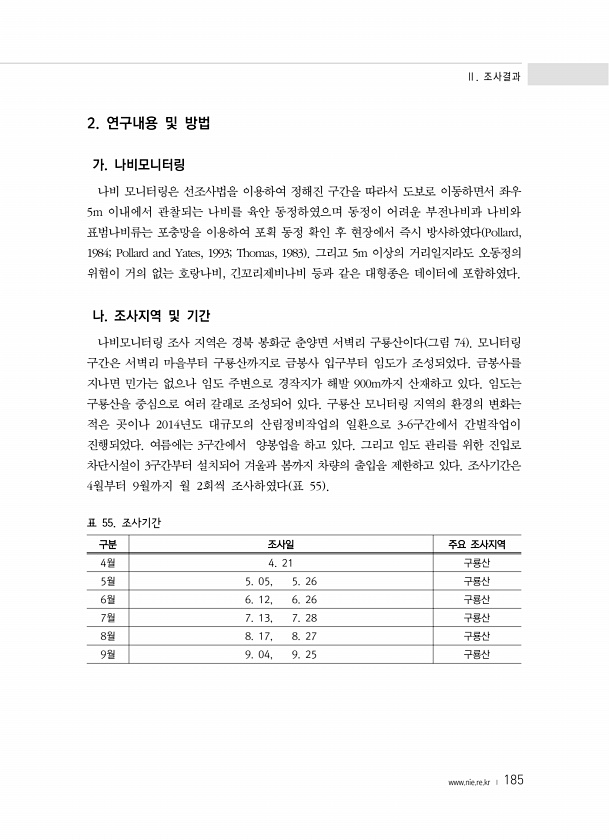 Ⅱ. 조사결과 www.nie.re.kr ? 185 2. 연구내용 및 방법 가. 나비모니터링 나비 모니터링은 선조사법을 이용하여 정해진 구간을 따라서 도보로 이동하면서 좌우 5m 이내에서 관찰되는 나비를 육안 동정하였으며 동정이 어려운 부전나비과 나비와 표범나비류는 포충망을 이용하여 포획 동정 확인 후 현장에서 즉시 방사하였다 Pollard, 1984; Pollard and Yates, 1993; Thomas, 1983 그리고 5m 이상의 거리일지라도 오동정의 위험이 거의 없는 호랑나비, 긴꼬리제비나비 등과 같은 대형종은 데이터에 포함하였다. 나. 조사지역 및 기간 나비모니터링 조사 지역은 경북 봉화군 춘양면 서벽리 구룡산이다 그림 74 모니터링 구간은 서벽리 마을부터 구룡산까지로 금봉사 입구부터 임도가 조성...