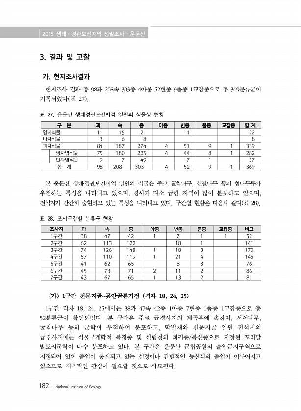 2015 생태·경관보전지역 정밀조사 운문산 182 ? National Institute of Ecology 3. 결과 및 고찰 가. 현지조사결과 현지조사 결과 총 98과 208속 303종 4아종 52변종 9품종 1교잡종으로 총 369분류군이 기록되었다 표 27 표 27. 운문산 생태경관보전지역 일원의 식물상 현황 구 분 과 속 종 아종 변종 품종 교잡종 합 계 양치식물 11 15 21 1 22 나자식물 3 6 8 8 피자식물 84 187 274 4 51 9 1 339 쌍자엽식물 75 180 225 4 44 8 1 282 단자엽식물 9 7 49 7 1 57 합 계 98 208 303 4 52 9 1 369 본 운문산 생태?경관보전지역 일원의 식물은 주로 굴참나무, 신갈나무 등의 참나무류가 우점하는 특성을 나타...