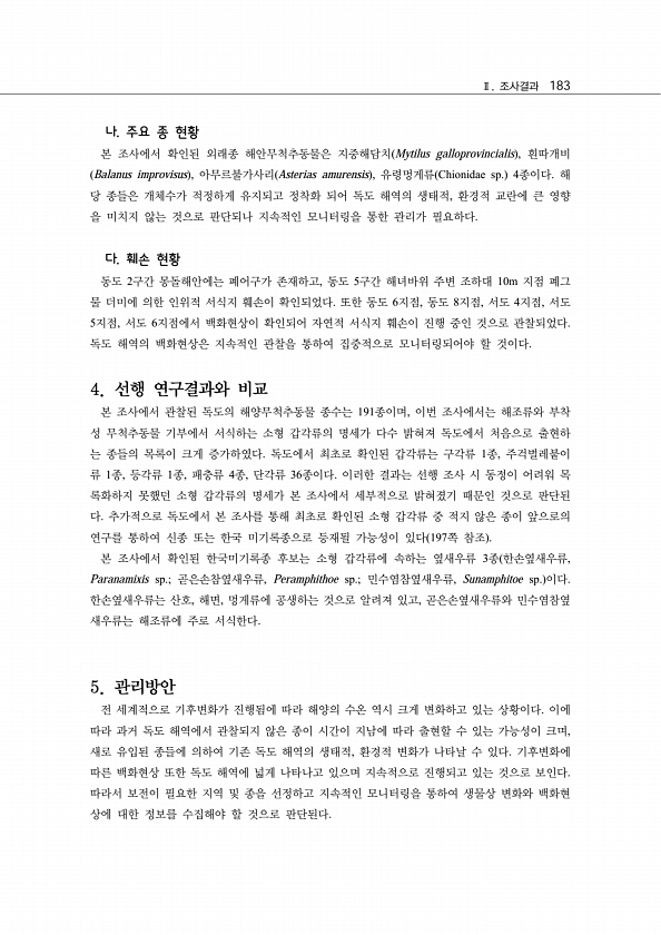 Ⅱ. 조사결과 183 나. 주요 종 현황 본 조사에서 확인된 외래종 해안무척추동물은 지중해담치 Mytilus galloprovincialis , 흰따개비 Balanus improvisus , 아무르불가사리 Asterias amurensis , 유령멍게류 Chionidae sp. 4종이다. 해 당 종들은 개체수가 적정하게 유지되고 정착화 되어 독도 해역의 생태적, 환경적 교란에 큰 영향 을 미치지 않는 것으로 판단되나 지속적인 모니터링을 통한 관리가 필요하다. 다. 훼손 현황 동도 2구간 몽돌해안에는 폐어구가 존재하고, 동도 5구간 해녀바위 주변 조하대 10m 지점 폐그 물 더미에 의한 인위적 서식지 훼손이 확인되었다. 또한 동도 6지점, 동도 8지점, 서도 4지점, 서도 5지점, 서도 6지점에서 백화현상이 ...