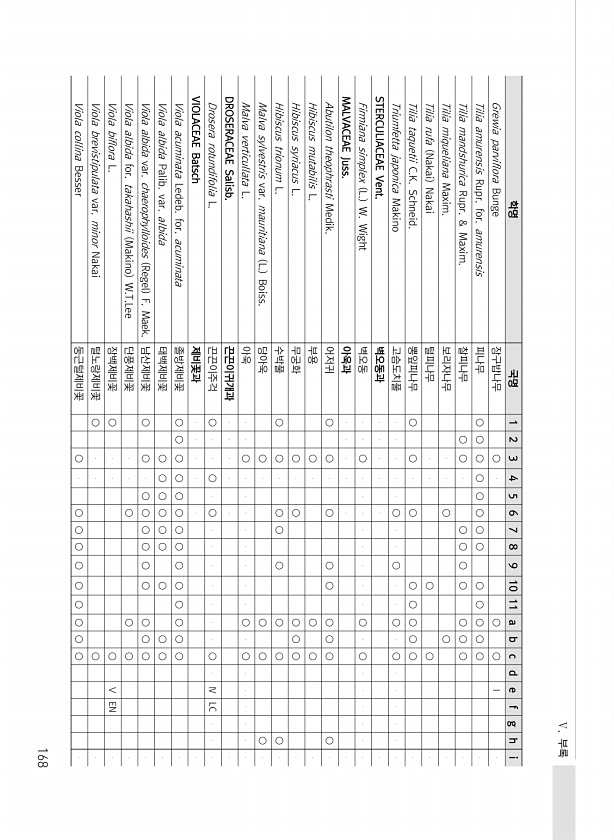 Ⅴ. 부록 168 학명 국명 1 2 3 4 5 6 7 8 9 10 11 a b c d e f g h i Grewia parviflora Bunge 장구밥나무 ○ ○ ○ Ⅰ Tilia amurensis Rupr. for. amurensis 피나무 ○ ○ ○ ○ ○ ○ ○ ○ ○ ○ ○ ○ ○ Tilia mandshurica Rupr. & Maxim. 찰피나무 ○ ○ ○ ○ ○ ○ ○ ○ ○ Tilia miqueliana Maxim. 보리자나무 ○ ○ Tilia rufa Nakai Nakai 털피나무 ○ ○ Tilia taquetii C.K. Schneid. 뽕잎피나무 ○ ○ ○ ○ ○ ○ ○ ○ Triumfetta japonica Makino 고슴도치풀 ○ ○ ○ ○ STERCULIACEAE Vent. 벽오동...