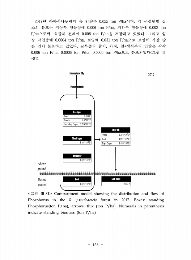 158 2017년 아까시나무림의 총 인량은 0.055 ton P/ha이며, 각 구성원별 질 소의 분포는 지상부 생물량에 0.006 ton P/ha, 지하부 생물량에 0.002 ton P/ha으로써, 식물체 전체에 0.008 ton P/ha을 저장하고 있었다. 그리고 임 상 낙엽층에 0.0004 ton P/ha, 토양에 0.031 ton P/ha으로 토양에 가장 많 은 인이 분포하고 있었다. 교목층의 줄기, 가지, 잎+생식부의 인량은 각각 0.006 ton P/ha, 0.0006 ton P/ha, 0.0005 ton P/ha으로 분포되었다 그림 Ⅲ -81 그림 Ⅲ-81 Compartment model showing the distribution and flow of Phosphorus in the R. pse...