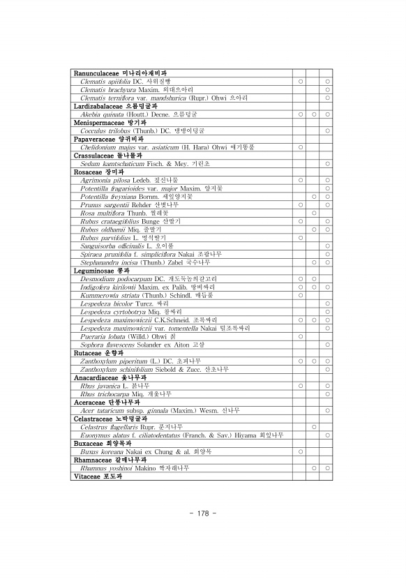 178 Ranunculaceae 미나리아재비과 Clematis apiifolia DC. 사위질빵 ○ ○ Clematis brachyura Maxim. 외대으아리 ○ Clematis terniflora var. mandshurica Rupr. Ohwi 으아리 ○ Lardizabalaceae 으름덩굴과 Akebia quinata Houtt. Decne. 으름덩굴 ○ ○ ○ Menispermaceae 방기과 Cocculus trilobus Thunb. DC. 댕댕이덩굴 ○ Papaveraceae 양귀비과 Chelidonium majus var. asiaticum H. Hara Ohwi 애기똥풀 ○ Crassulaceae 돌나물과 Sedum kamtschaticum Fisch. & Mey. 기린초 ○ Rosacea...