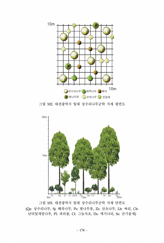 그림 102. 대전광역시 일대 상수리나무군락 식재 평면도 그림 103. 대전광역시 일대 상수리나무군락 식재 단면도 Qa상수리나무, Sj때죽나무, Ps벚나무류, Zs산초나무, Lb싸리, Ch난티잎개암나무, Pl파리풀, Cl그늘사초, Ds애기나리, Ss큰기름새 174