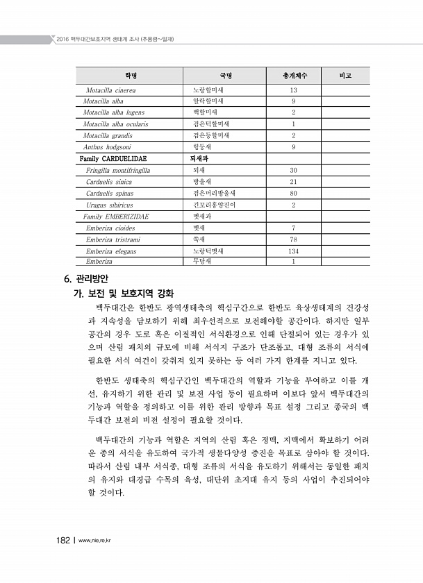 2016 백두대간보호지역 생태계 조사 추풍령밀재 182Ⅰwww.nie.re.kr 학명 국명 총개체수 비고 Motacilla cinerea 노랑할미새 13 Motacilla alba 알락할미새 9 Motacilla alba lugens 백할미새 2 Motacilla alba ocularis 검은턱할미새 1 Motacilla grandis 검은등할미새 2 Anthus hodgsoni 힝둥새 9 Family CARDUELIDAE 되새과 Fringilla montifringilla 되새 30 Carduelis sinica 방울새 21 Carduelis spinus 검은머리방울새 80 Uragus sibiricus 긴꼬리홍양진이 2 Family EMBERIZIDAE 멧새과 Emberiza cioides 멧새 7 Em...