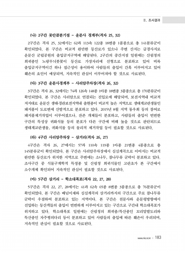 Ⅱ. 조사결과 www.nie.re.kr ? 183 나 2구간 못안골분기점 운문사 경계부 격자 25, 32 2구간은 격자 25, 32에서는 62과 113속 122종 18변종 1품종으로 총 141분류군이 확인되었다. 본 구간은 비교적 완만한 등산로가 있으나 주변 산지는 급경사지로 운문산 군립공원의 출입금지구역에 해당된다. 2구간의 중간지점 일원에는 산림청의 희귀종인 노랑무늬붓꽃이 등산로 가장자리에 선형으로 분포하고 있어 비록 출입금지구역이긴 하나 접근성이 용이하여 사람들의 출입이 간혹 이루어지고 있어 훼손의 요인이 예상되며, 지속적인 관심이 이루어져야 할 것으로 사료된다. 다 3구간 운문사경계부 사리암주차장 격자 26, 32 3구간은 격자 26, 32에서는 74과 126속 148종 1아종 18변종 3품종으로 총...