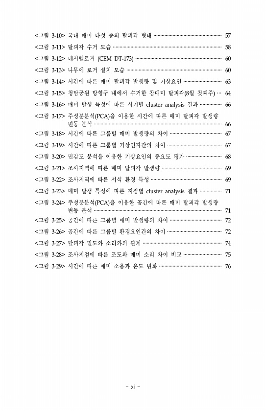 그림 3-10 국내 매미 다섯 종의 탈피각 형태 ·················································· 57 그림 3-11 탈피각 수거 모습 ················································································ 58 그림 3-12 데시벨로거 CEM DT-173 ······························································· 60 그림 3-13 나무에 로거 설치 모습 ······································································ 60 그림 3-14 시간에 따른 매미 탈피각 발생량 및 기상...