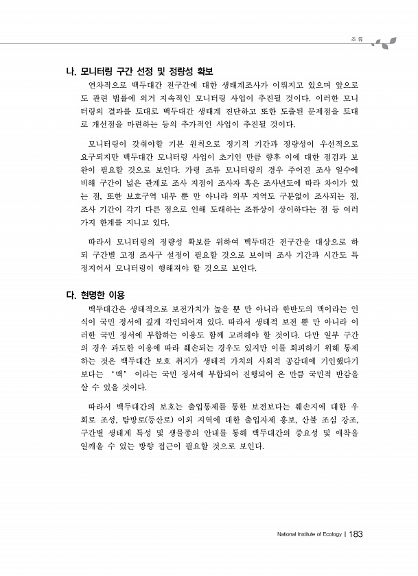 조 류 National Institute of EcologyⅠ183 나. 모니터링 구간 선정 및 정량성 확보 연차적으로 백두대간 전구간에 대한 생태계조사가 이뤄지고 있으며 앞으로 도 관련 법률에 의거 지속적인 모니터링 사업이 추진될 것이다. 이러한 모니 터링의 결과를 토대로 백두대간 생태계 진단하고 또한 도출된 문제점을 토대 로 개선점을 마련하는 등의 추가적인 사업이 추진될 것이다. 모니터링이 갖춰야할 기본 원칙으로 정기적 기간과 정량성이 우선적으로 요구되지만 백두대간 모니터링 사업이 초기인 만큼 향후 이에 대한 점검과 보 완이 필요할 것으로 보인다. 가령 조류 모니터링의 경우 주어진 조사 일수에 비해 구간이 넓은 관계로 조사 지점이 조사자 혹은 조사년도에 따라 차이가 있 는 점, 또한 보호구역 내부 뿐 만...
