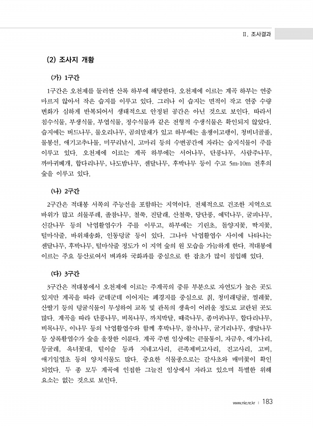 Ⅱ. 조사결과 www.nie.re.kr ? 183 2 조사지 개황 가 1구간 1구간은 오천제를 둘러싼 산록 하부에 해당한다. 오천제에 이르는 계곡 하부는 연중 마르지 않아서 작은 습지를 이루고 있다. 그러나 이 습지는 면적이 작고 연중 수량 변화가 심하게 반복되어서 생태적으로 안정된 공간은 아닌 것으로 보인다. 따라서 침수식물, 부생식물, 부엽식물, 정수식물과 같은 전형적 수생식물은 확인되지 않았다. 습지에는 버드나무, 물오리나무, 곰의말채가 있고 하부에는 올챙이고랭이, 청비녀골풀, 물봉선, 애기고추나물, 미꾸리낚시, 고마리 등의 수변공간에 자라는 습지식물이 주를 이루고 있다. 오천제에 이르는 계곡 하부에는 서어나무, 단풍나무, 사람주나무, 까마귀베개, 합다리나무, 나도밤나무, 센달나무, 후박나무 등이 수고...