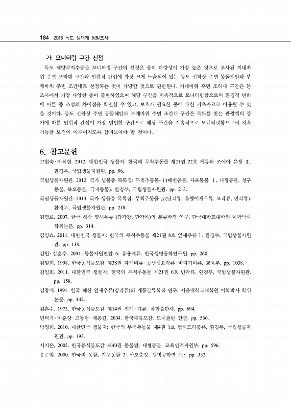 184 2015 독도 생태계 정밀조사 가. 모니터링 구간 선정 독도 해양무척추동물 모니터링 구간의 선정은 종의 다양성이 가장 높은 것으로 조사된 지네바 위 주변 조하대 구간과 인위적 간섭에 가장 크게 노출되어 있는 동도 선착장 주변 몽돌해안과 부 채바위 주변 조간대로 선정하는 것이 타당할 것으로 판단된다. 지네바위 주변 조하대 구간은 본 조사에서 가장 다양한 종이 출현하였으며 해당 구간을 지속적으로 모니터링함으로써 환경적 변화 에 따른 종 조성의 차이점을 확인할 수 있고, 보호가 필요한 종에 대한 기초자료로 이용될 수 있 을 것이다. 동도 선착장 주변 몽돌해안과 부채바위 주변 조간대 구간은 독도를 찾는 관광객의 증 가에 따른 인위적 간섭이 가장 빈번한 구간으로 해당 구간을 지속적으로 모니터링함으로써 지속 가...