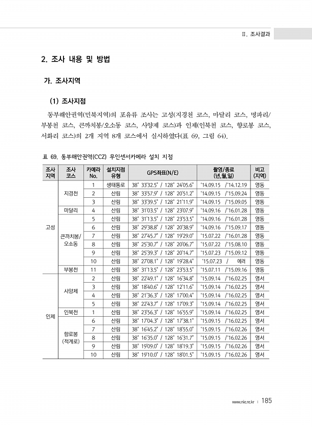 Ⅱ. 조사결과 www.nie.re.kr ? 185 2. 조사 내용 및 방법 가. 조사지역 1 조사지점 동부해안권역 민북지역 의 포유류 조사는 고성 지경천 코스, 마달리 코스, 명파리/ 부봉천 코스, 큰까치봉/오소동 코스, 사양제 코스 과 인제 인북천 코스, 향로봉 코스, 서화리 코스 의 2개 지역 8개 코스에서 실시하였다 표 69, 그림 64 조사 지역 조사 코스 카메라 No. 설치지점 유형 GPS좌표 N/E 촬영/종료 년,월,일 지역 비고 고성 지경천 1 생태통로 38°3332.5128°2405.6‘14.09.15 /‘14.12.19 영동 2 산림 38°3357.9128°2051.2‘14.09.15 /‘15.09.24 영동 3 산림 38°3339.5128°2111.9‘14.09.15 /‘15.09.05 영...