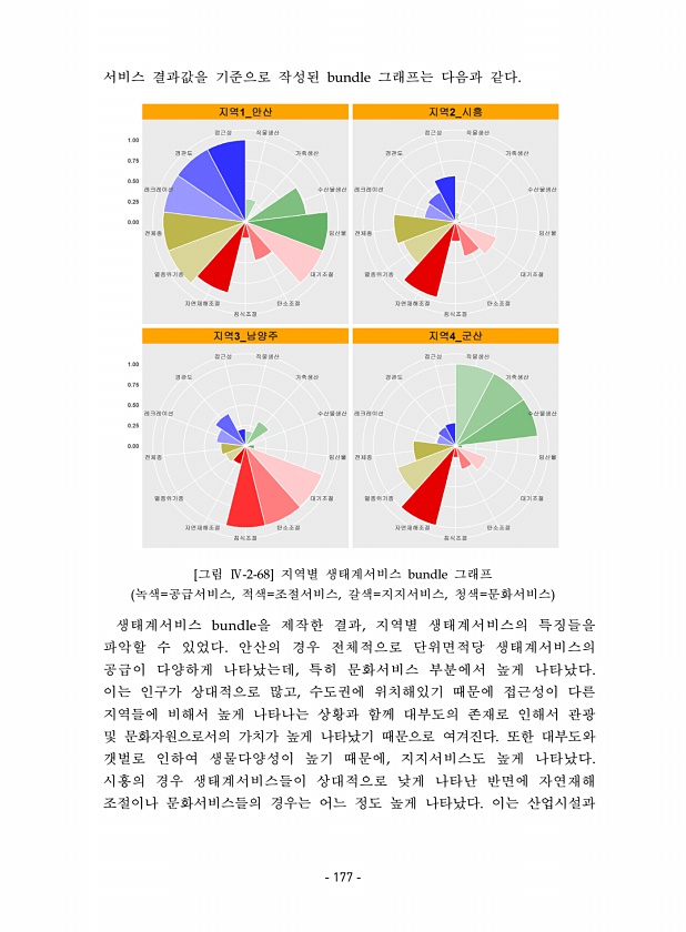 서비스 결과값을 기준으로 작성된 bundle 그래프는 다음과 같다. [그림 Ⅳ-2-68] 지역별 생태계서비스 bundle 그래프 녹색=공급서비스, 적색=조절서비스, 갈색=지지서비스, 청색=문화서비스 생태계서비스 bundle을 제작한 결과, 지역별 생태계서비스의 특징들을 파악할 수 있었다. 안산의 경우 전체적으로 단위면적당 생태계서비스의 공급이 다양하게 나타났는데, 특히 문화서비스 부분에서 높게 나타났다. 이는 인구가 상대적으로 많고, 수도권에 위치해있기 때문에 접근성이 다른 지역들에 비해서 높게 나타나는 상황과 함께 대부도의 존재로 인해서 관광 및 문화자원으로서의 가치가 높게 나타났기 때문으로 여겨진다. 또한 대부도와 갯벌로 인하여 생물다양성이 높기 때문에, 지지서비스도 높게 나타났다. 시흥의 경우 생태계서...