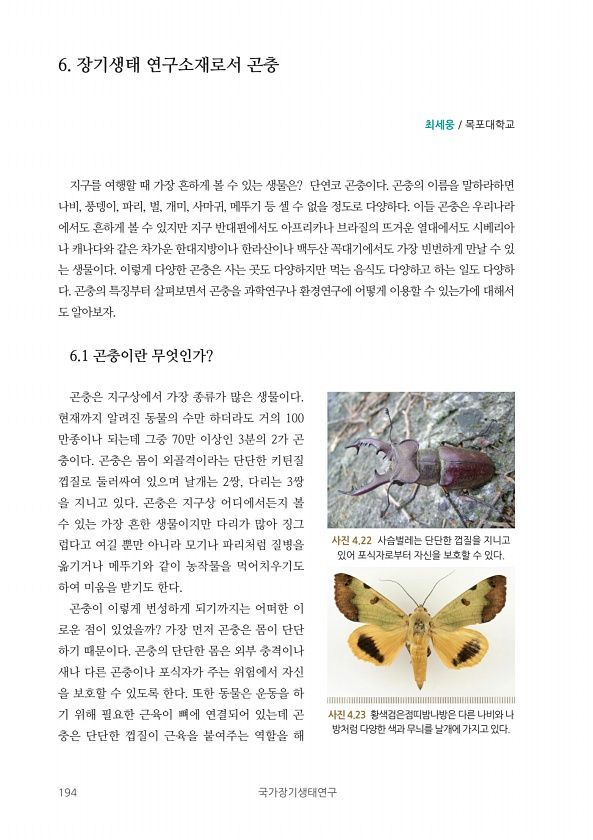 194 국가장기생태연구 6. 장기생태 연구소재로서 곤충 최세웅 목포대학교 지구를 여행할 때 가장 흔하게 볼 수 있는 생물은? 단연코 곤충이다. 곤충의 이름을 말하라하면 나비, 풍뎅이, 파리, 벌, 개미, 사마귀, 메뚜기 등 셀 수 없을 정도로 다양하다. 이들 곤충은 우리나라 에서도 흔하게 볼 수 있지만 지구 반대편에서도 아프리카나 브라질의 뜨거운 열대에서도 시베리아 나 캐나다와 같은 차가운 한대지방이나 한라산이나 백두산 꼭대기에서도 가장 빈번하게 만날 수 있 는 생물이다. 이렇게 다양한 곤충은 사는 곳도 다양하지만 먹는 음식도 다양하고 하는 일도 다양하 다. 곤충의 특징부터 살펴보면서 곤충을 과학연구나 환경연구에 어떻게 이용할 수 있는가에 대해서 도 알아보자. 6.1 곤충이란 무엇인가? 곤충은 지구상에서 가...