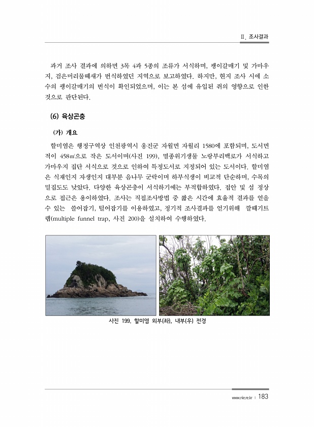Ⅱ. 조사결과 www.nie.re.kr ? 183 과거 조사 결과에 의하면 3목 4과 5종의 조류가 서식하며, 괭이갈매기 및 가마우 지, 검은머리물떼새가 번식하였던 지역으로 보고하였다. 하지만, 현지 조사 시에 소 수의 괭이갈매기의 번식이 확인되었으며, 이는 본 섬에 유입된 쥐의 영향으로 인한 것으로 판단된다. 6 육상곤충 가 개요 할미염은 행정구역상 인천광역시 옹진군 자월면 자월리 1580에 포함되며, 도서면 적이 458㎡으로 작은 도서이며 사진 199 , 멸종위기생물 노랑부리백로가 서식하고 가마우지 집단 서식으로 것으로 인하여 특정도서로 지정되어 있는 도서이다. 할미염 은 식재인지 자생인지 대부분 음나무 군락이며 하부식생이 비교적 단순하며, 수목의 밀집도도 낮았다. 다양한 육상곤충이 서식하기에는 부적합하...