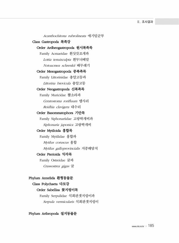Ⅱ. 조사결과 www.nie.re.kr ? 185 Acanthochitona rubrolineata 애기털군부 Class Gastropoda 복족강 Order Ardheogastropoda 원시복족목 Family Acmaeidae 흰삿갓조개과 Lottia tenuisculpta 흰무늬배말 Notoacmea schrenkii 배무래기 Order Mesogastropoda 중복족목 Family Littorinidae 총알고둥과 Littorina brevicula 총알고둥 Order Neogastropoda 신복족목 Family Muricidae 뿔소라과 Ceratostoma rorifluum 맵사리 Reidhia clavigera 대수리 Order Basommatophora 기안목 Family Siphonari...