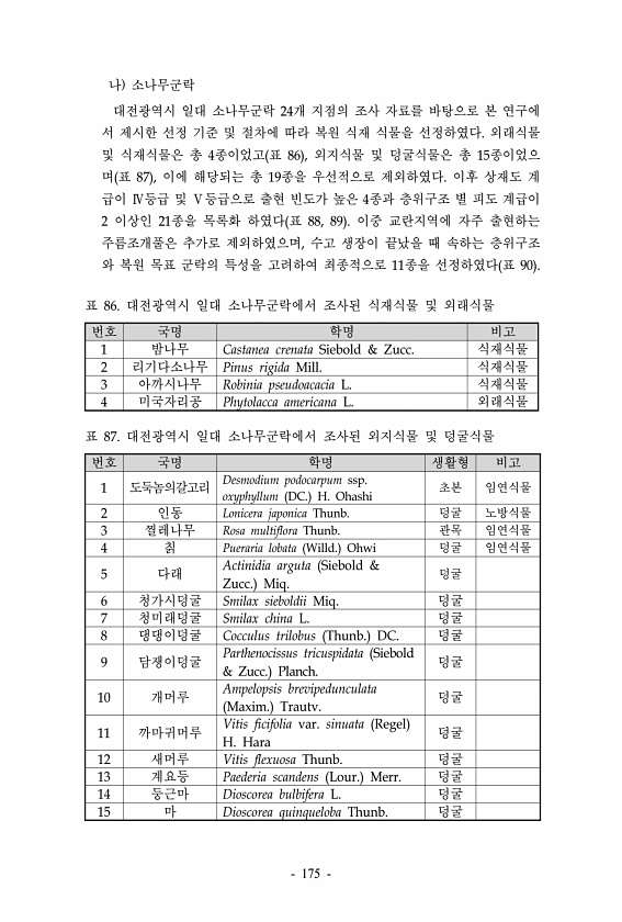 나 소나무군락 대전광역시 일대 소나무군락 24개 지점의 조사 자료를 바탕으로 본 연구에 서 제시한 선정 기준 및 절차에 따라 복원 식재 식물을 선정하였다. 외래식물 및 식재식물은 총 4종이었고 표 86 , 외지식물 및 덩굴식물은 총 15종이었으 며 표 87 , 이에 해당되는 총 19종을 우선적으로 제외하였다. 이후 상재도 계 급이 Ⅳ등급 및 Ⅴ등급으로 출현 빈도가 높은 4종과 층위구조 별 피도 계급이 2 이상인 21종을 목록화 하였다 표 88, 89 이중 교란지역에 자주 출현하는 주름조개풀은 추가로 제외하였으며, 수고 생장이 끝났을 때 속하는 층위구조 와 복원 목표 군락의 특성을 고려하여 최종적으로 11종을 선정하였다 표 90 번호 국명 학명 비고 1 밤나무 Castanea crenata Siebold & ...