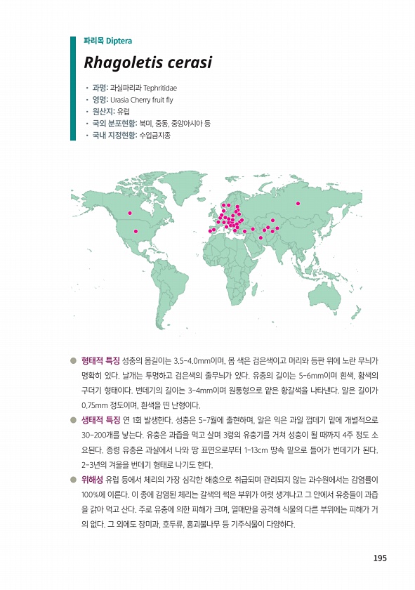 195 ● 형태적 특징 성충의 몸길이는 3.5-4.0mm이며, 몸 색은 검은색이고 머리와 등판 위에 노란 무늬가 명확히 있다. 날개는 투명하고 검은색의 줄무늬가 있다. 유충의 길이는 5-6mm이며 흰색, 황색의 구더기 형태이다. 번데기의 길이는 3-4mm이며 원통형으로 얕은 황갈색을 나타낸다. 알은 길이가 0.75mm 정도이며, 흰색을 띤 난형이다. ● 생태적 특징 연 1회 발생한다. 성충은 5-7월에 출현하며, 알은 익은 과일 껍데기 밑에 개별적으로 30-200개를 낳는다. 유충은 과즙을 먹고 살며 3령의 유충기를 거쳐 성충이 될 때까지 4주 정도 소 요된다. 종령 유충은 과실에서 나와 땅 표면으로부터 1-13cm 땅속 밑으로 들어가 번데기가 된다. 2-3년의 겨울을 번데기 형태로 나기도 한다. ● 위해성...