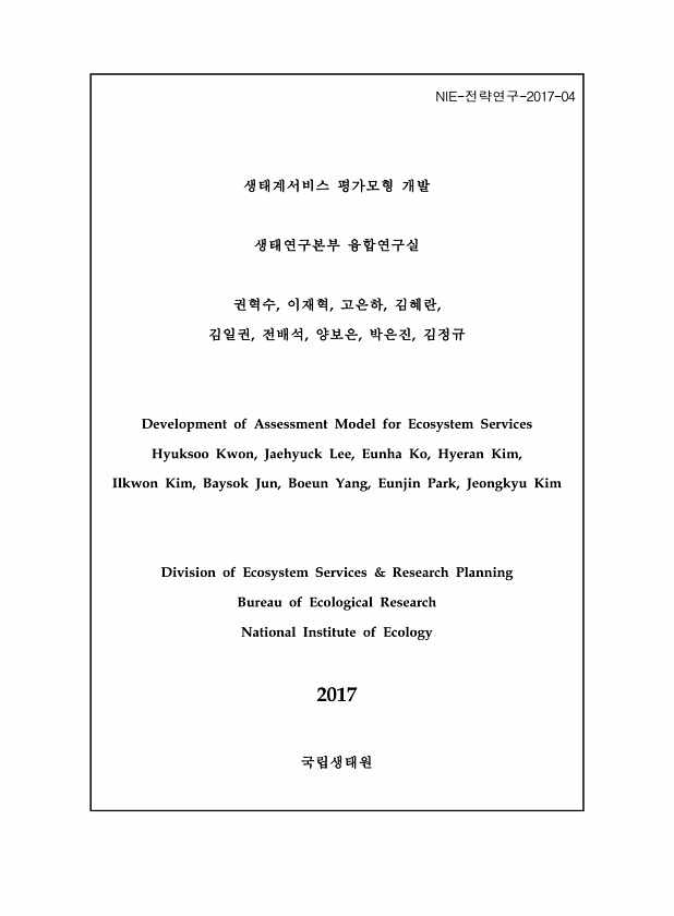 NIE-전략연구-2017-04 생태계서비스 평가모형 개발 생태연구본부 융합연구실 권혁수, 이재혁, 고은하, 김혜란, 김일권, 전배석, 양보은, 박은진, 김정규 Development of Assessment Model for Ecosystem Services Hyuksoo Kwon, Jaehyuck Lee, Eunha Ko, Hyeran Kim, Ilkwon Kim, Baysok Jun, Boeun Yang, Eunjin Park, Jeongkyu Kim Division of Ecosystem Services & Research Planning Bureau of Ecological Research National Institute of Ecology 2017국립생태원