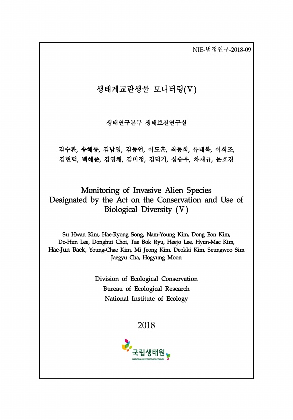 생태연구본부 생태보전연구실 생태계교란생물 모니터링 Ⅴ 김수환, 송해룡, 김남영, 김동언, 이도훈, 최동희, 류태복, 이희조, 김현맥, 백혜준, 김영채, 김미정, 김덕기, 심승우, 차재규, 문호경 Monitoring of Invasive Alien Species Designated by the Act on the Conservation and Use of Biological Diversity Ⅴ Su Hwan Kim, Hae-Ryong Song, Nam-Young Kim, Dong Eon Kim, Do-Hun Lee, Donghui Choi, Tae Bok Ryu, Heejo Lee, Hyun-Mac Kim, Hae-Jun Baek, Young-Chae Kim, Mi Jeong Kim, Deokki Kim, ...