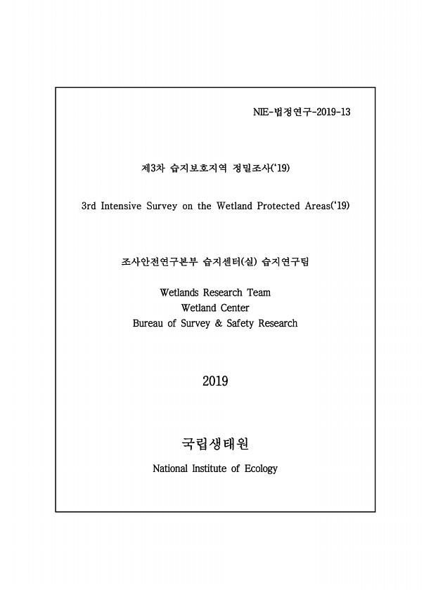 NIE-법정연구-2019-13 제3차 습지보호지역 정밀조사 `19 3rd Intensive Survey on the Wetland Protected Areas `19 조사안전연구본부 습지센터 실 습지연구팀 Wetlands Research Team Wetland Center Bureau of Survey & Safety Research 2019 국립생태원 National Institute ofEcology