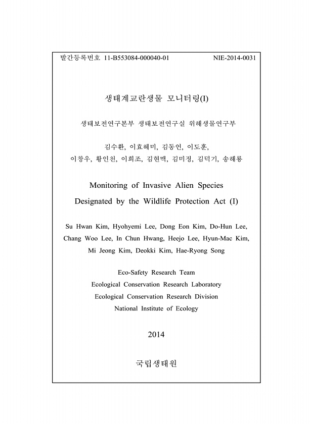 발간등록번호 11-B553084-000040-01 NIE-2014-0031 생태계교란생물 모니터링 I 생태보전연구본부 생태보전연구실 위해생물연구부 김수환, 이효혜미, 김동언, 이도훈, 이창우, 황인천, 이희조, 김현맥, 김미정, 김덕기, 송해룡 Monitoring of Invasive Alien Species Designated by the Wildlife Protection Act I Su Hwan Kim, Hyohyemi Lee, Dong Eon Kim, Do-Hun Lee, Chang Woo Lee, In Chun Hwang, Heejo Lee, Hyun-Mac Kim, Mi Jeong Kim, Deokki Kim, Hae-Ryong Song Eco-Safety Research Team Ecologic...