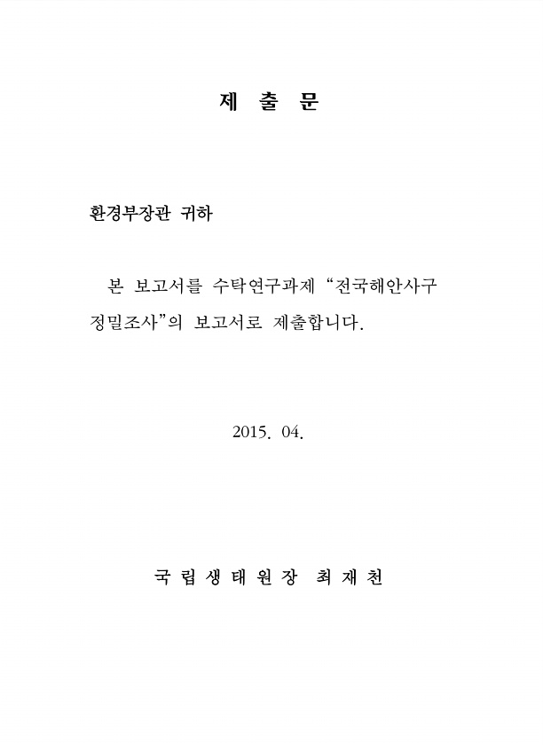 제 출 문 환경부장관 귀하 본 보고서를 수탁연구과제 “전국해안사구 정밀조사”의 보고서로 제출합니다. 2015. 04. 국 립 생 태 원 장 최 재천