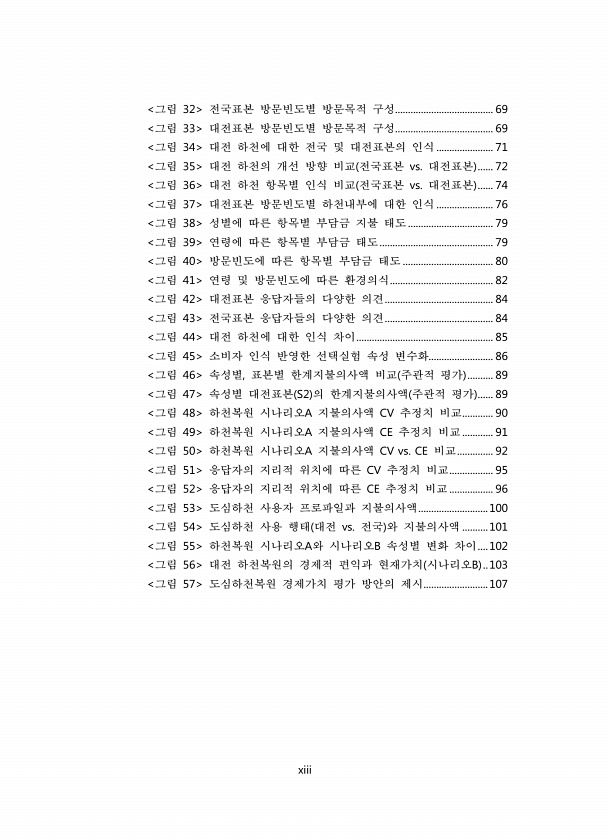 xiii 그림 32 전국표본 방문빈도별 방문목적 구성...................................... 69 그림 33 대전표본 방문빈도별 방문목적 구성...................................... 69 그림 34 대전 하천에 대한 전국 및 대전표본의 인식 ...................... 71 그림 35 대전 하천의 개선 방향 비교 전국표본 vs. 대전표본 ...... 72 그림 36 대전 하천 항목별 인식 비교 전국표본 vs. 대전표본 ...... 74 그림 37 대전표본 방문빈도별 하천내부에 대한 인식 ...................... 76 그림 38 성별에 따른 항목별 부담금 지불 태도................................. ...