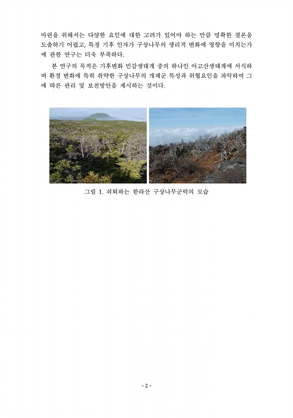 2 마련을 위해서는 다양한 요인에 대한 고려가 있어야 하는 만큼 명확한 결론을 도출하기 어렵고, 특정 기후 인자가 구상나무의 생리적 변화에 영향을 미치는가 에 관한 연구는 더욱 부족하다. 본 연구의 목적은 기후변화 민감생태계 중의 하나인 아고산생태계에 서식하 며 환경 변화에 특히 취약한 구상나무의 개체군 특성과 위협요인을 파악하여 그 에 따른 관리 및 보전방안을 제시하는 것이다. 그림 1. 쇠퇴하는 한라산 구상나무군락의 모습 2