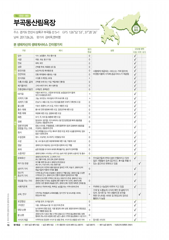 No. 안산 본 생태자산의 생태계서비스 간이평가지 구분 예시 평가 등급 설명 규모별 혜택 지점 지역 국가 공급 담수 식수, 농업용수, 축산 용수 등 0 사람에게 제공되는 서비스는 거의 없으며, 야생동식물의 서식에 공급서비스가 제공됨 √ 식량 곡물, 과실, 물고기 등 0 √ 연료 화목, 토탄 0 √ 섬유 건축용 목재, 의류용 섬유 등 0 √ 유전자원 농업·축산업 희귀품종 등 0 √ 천연약재 전통 의약품에 사용되는 식물 0 √ 장식재료 수집용 조개껍질, 꽃 등 + √ 진흙,미네랄, 골재 건축용 모래 또는 자갈, 벽돌재료 진흙 등 0 √ 폐기물처리 고체 쓰레기 하치, 폐수 방류 등 0 √ 친환경에너지발전 조력발전, 풍력발전 0 √ 조절 대기질 자동차 배기가스, 산업체 대기오염, 농업발생 먼지 등의 대기 미세물질의...