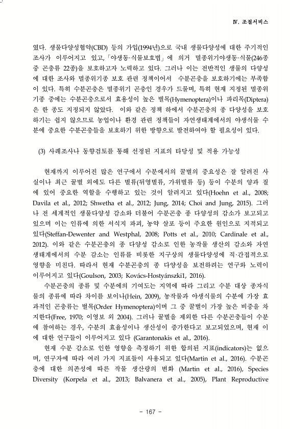 Ⅳ. 조절서비스 167 였다. 생물다양성협약 CBD 등의 가입 1994년 으로 국내 생물다양성에 대한 주기적인 조사가 이루어지고 있고,「야생동·식물보호법」에 의거 멸종위기야생동·식물 246종 중 곤충류 22종 을 보호하고자 노력하고 있다. 그러나 이는 전반적인 생물의 다양성 에 대한 조사와 멸종위기종 보호 관련 정책이어서 수분곤충을 보호하기에는 부족함 이 있다. 특히 수분곤충은 멸종위기 곤충인 경우가 드물며, 특히 현재 지정된 멸종위 기종 중에는 수분곤충으로서 효용성이 높은 벌목 Hymenoptera 이나 파리목 Diptera 은 한 종도 지정되지 않았다. 이와 같은 정책 하에서 수분곤충의 종 다양성을 보호 하기는 쉽지 않으므로 농업이나 환경 관련 정책들이 자연생태계에서의 야생식물 수 분에 중요한 수분곤충들...