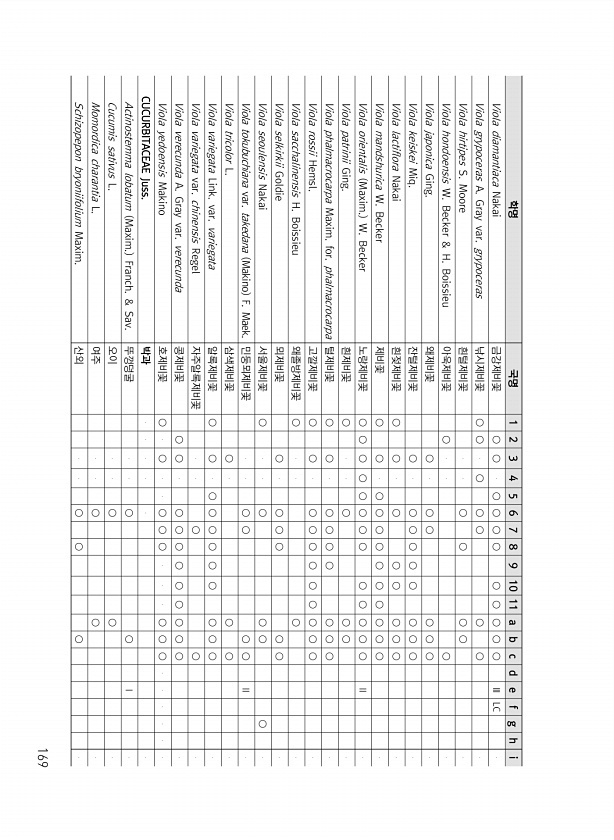 169 학명 국명 1 2 3 4 5 6 7 8 9 10 11 a b c d e f g h i Viola diamantiaca Nakai 금강제비꽃 ○ ○ ○ ○ ○ ○ ○ ○ ○ ○ ○ Ⅲ LC Viola grypoceras A. Gray var. grypoceras 낚시제비꽃 ○ ○ ○ ○ ○ ○ ○ Viola hirtipes S. Moore 흰털제비꽃 ○ ○ ○ ○ Viola hondoensis W. Becker & H. Boissieu 아욱제비꽃 ○ ○ Viola japonica Ging. 왜제비꽃 ○ ○ ○ ○ ○ ○ Viola keiskei Miq. 잔털제비꽃 ○ ○ ○ ○ ○ ○ ○ ○ ○ Viola lactiflora Nakai 흰젖제비꽃 ○ ○ ○ ○ ○ ○ ○ ○ Viola mandshuri...