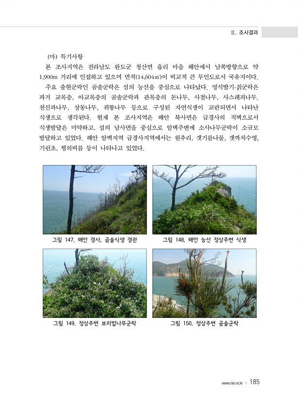 Ⅱ. 조사결과 www.nie.re.kr ? 185 마 특기사항 본 조사지역은 전라남도 완도군 청산면 읍리 마을 해안에서 남쪽방향으로 약 1,900m 거리에 인접하고 있으며 면적 14,604㎡ 이 비교적 큰 무인도로서 국유지이다. 주요 출현군락인 곰솔군락은 섬의 능선을 중심으로 나타났다. 멍석딸기-칡군락은 과거 교목층, 아교목층의 곰솔군락과 관목층의 돈나무, 사철나무, 사스레피나무. 천선과나무, 상동나무, 쥐똥나무 등으로 구성된 자연식생이 교란되면서 나타난 식생으로 생각된다. 현재 본 조사지역은 해안 북사면은 급경사의 직벽으로서 식생발달은 미약하고, 섬의 남사면을 중심으로 암벽주변에 소사나무군락이 소규모 발달하고 있었다. 해안 암벽지역 급경사지역에서는 원추리, 갯기름나물, 갯까치수영, 기린초, 꿩의비름 등이 ...
