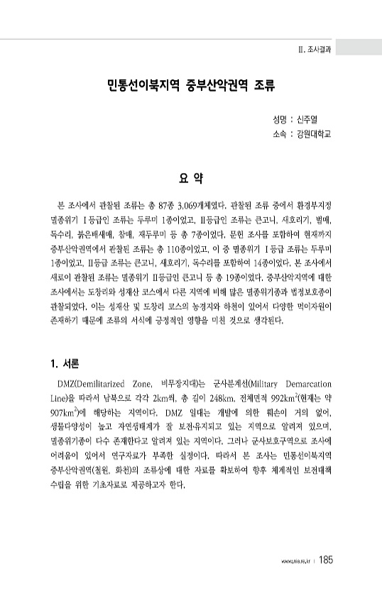 Ⅱ. 조사결과 www.nie.re.kr ? 185 민통선이북지역 중부산악권역 조류 성명 신주열 소속 강원대학교 요 약 본 조사에서 관찰된 조류는 총 87종 3,069개체였다. 관찰된 조류 중에서 환경부지정 멸종위기 Ⅰ등급인 조류는 두루미 1종이었고, Ⅱ등급인 조류는 큰고니, 새호리기, 벌매, 독수리, 붉은배새매, 참매, 재두루미 등 총 7종이었다. 문헌 조사를 포함하여 현재까지 중부산악권역에서 관찰된 조류는 총 110종이었고, 이 중 멸종위기 Ⅰ등급 조류는 두루미 1종이었고, Ⅱ등급 조류는 큰고니, 새호리기, 독수리를 포함하여 14종이었다. 본 조사에서 새로이 관찰된 조류는 멸종위기 Ⅱ등급인 큰고니 등 총 19종이었다. 중부산악지역에 대한 조사에서는 도창리와 성재산 코스에서 다른 지역에 비해 많은 멸종위기종...