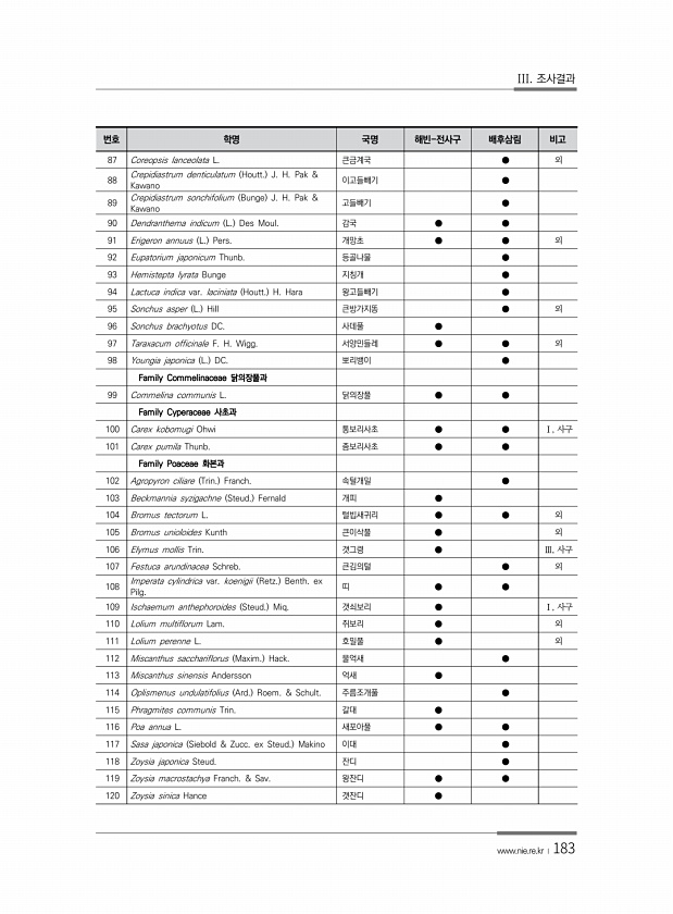 III. 조사결과 www.nie.re.kr ?183 번호 학명 국명 해빈-전사구 배후삼림 비고 87 Coreopsis lanceolata L. 큰금계국 ● 외 88 Crepidiastrum denticulatum Houtt. J. H. Pak & Kawano 이고들빼기 ● 89 Crepidiastrum sonchifolium Bunge J. H. Pak & Kawano 고들빼기 ● 90 Dendranthema indicum L. Des Moul. 감국 ● ● 91 Erigeron annuus L. Pers. 개망초 ● ● 외 92 Eupatorium japonicum Thunb. 등골나물 ● 93 Hemistepta lyrata Bunge 지칭개 ● 94 Lactuca indica var. laciniata...