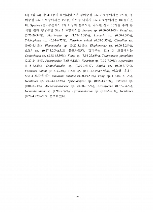 169 74 411 Site 2 229 , Site 3 155 , Site 4 189 Species 1% 10 Site 2 Inocybe sp. 0.00-60.14% , Fungi sp. 5.72-26.34% , Mortierella sp. 1.74-12.58% , Laccaria sp. 0.00-9.39% , Trichophaea sp. 0.04-6.77% , Fusarium solani 0.08-5.55% , Clavulina sp. 0.00-4.41% , Pleosporales sp. 0.20-3.61% , Elaphomyces sp. 0.00-3.24% , GS11 sp. 0.27-3.20% Site 3 Coniochaeta sp. 8.68-65.59% , Fungi sp. 7.56-27.68% , ...