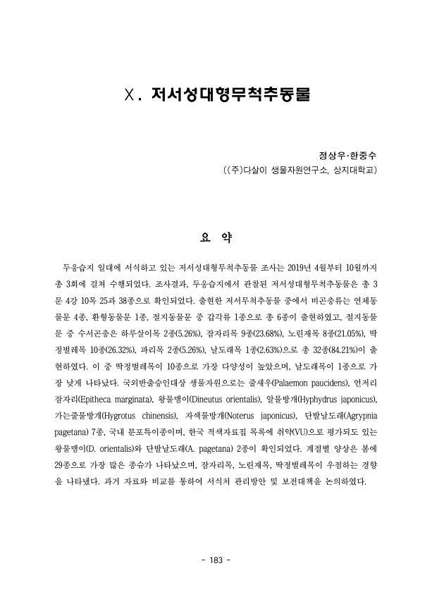 183 Ⅹ. 저서성대형무척추동물 정상우·한중수 주 다살이 생물자원연구소, 상지대학교 요 약 두웅습지 일대에 서식하고 있는 저서성대형무척추동물 조사는 2019년 4월부터 10월까지 총 3회에 걸쳐 수행되었다. 조사결과, 두웅습지에서 관찰된 저서성대형무척추동물은 총 3 문 4강 10목 25과 38종으로 확인되었다. 출현한 저서무척추동물 중에서 비곤충류는 연체동 물문 4종, 환형동물문 1종, 절지동물문 중 갑각류 1종으로 총 6종이 출현하였고, 절지동물 문 중 수서곤충은 하루살이목 2종 5.26% , 잠자리목 9종 23.68% , 노린재목 8종 21.05% , 딱 정벌레목 10종 26.32% , 파리목 2종 5.26% , 날도래목 1종 2.63% 으로 총 32종 84.21% 이 출 현하였다. 이 중 딱정벌레목이 ...
