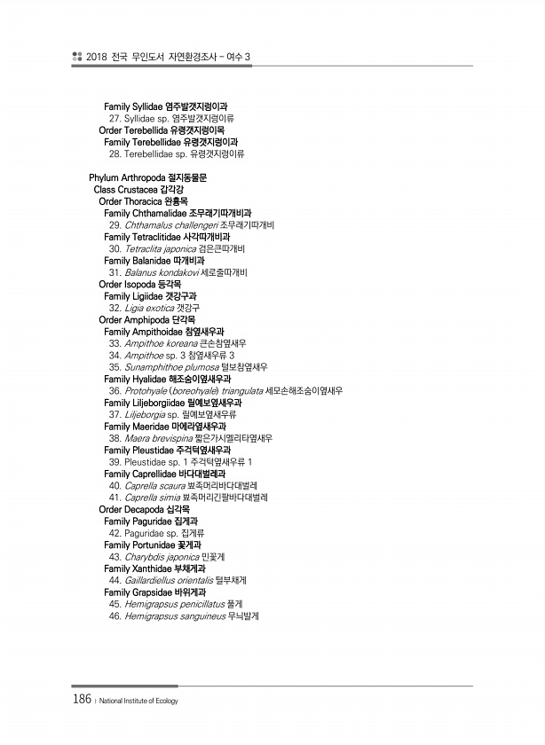 2018 전국 무인도서 자연환경조사 여수 3 186 ? National Institute of Ecology Family Syllidae 염주발갯지렁이과 27. Syllidae sp. 염주발갯지렁이류 Order Terebellida 유령갯지렁이목 Family Terebellidae 유령갯지렁이과 28. Terebellidae sp. 유령갯지렁이류 Phylum Arthropoda 절지동물문 Class Crustacea 갑각강 Order Thoracica 완흉목 Family Chthamalidae 조무래기따개비과 29. Chthamalus challengeri 조무래기따개비 Family Tetraclitidae 사각따개비과 30. Tetraclita japonica 검은큰따개비 Family Balanidae 따...