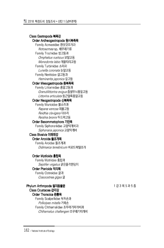 2018 특정도서 정밀조사 신안 1 남부권역 182 ? National Institute of Ecology Class Gastropoda 복족강 Order Ardheogastropoda 원시복족목 Family Acmaeidae 흰삿갓조개과 Notoacmea sp. 배무래기류 Family Trochidae 밤고둥과 Omphalius rusticus 보말고둥 Monodonta labio 개울타리고둥 Family Turbinidae 소라과 Lunella coronata 눈알고둥 Family Neritidae 갈고둥과 Heminerita japonica 갈고둥 Order Mesogastropoda 중복족목 Family Littorinidae 총알고둥과 Granulilittorina exigua 좁쌀무늬총알고둥 L...