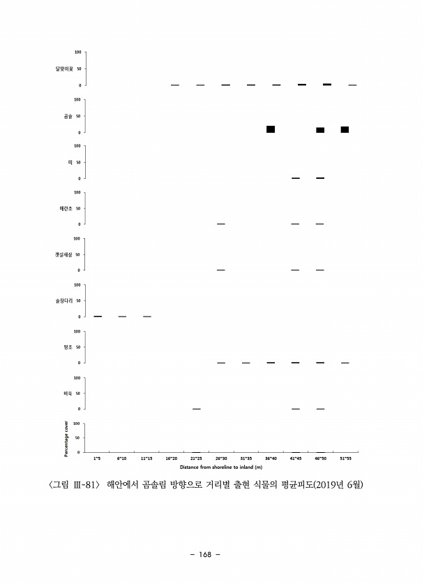 168 그림 Ⅲ-81 해안에서 곰솔림 방향으로 거리별 출현 식물의 평균피도 2019년 6월