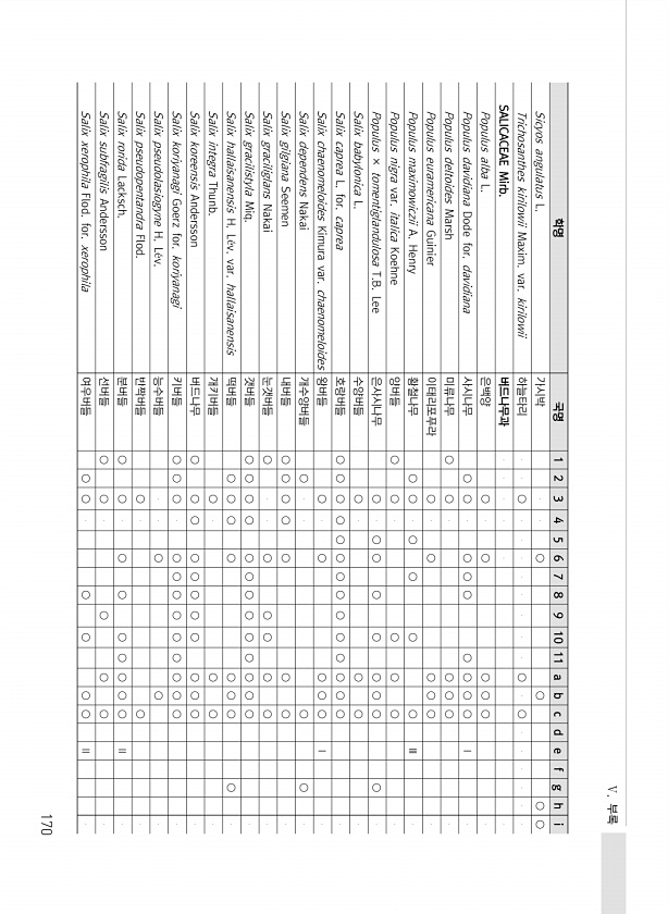 Ⅴ. 부록 170 학명 국명 1 2 3 4 5 6 7 8 9 10 11 a b c d e f g h i Sicyos angulatus L. 가시박 ○ ○ ○ ○ Trichosanthes kirilowii Maxim. var. kirilowii 하늘타리 ○ ○ ○ SALICACEAE Mirb. 버드나무과 Populus alba L. 은백양 ○ ○ ○ ○ ○ Populus davidiana Dode for. davidiana 사시나무 ○ ○ ○ ○ ○ ○ ○ ○ ○ Ⅰ Populus deltoides Marsh 미류나무 ○ ○ ○ ○ ○ Populus euramericana Guinier 이태리포푸라 ○ ○ ○ ○ ○ Populus maximowiczii A. Henry 황철나무 ○ ○ ○ ○ ○ ○ Ⅲ Pop...