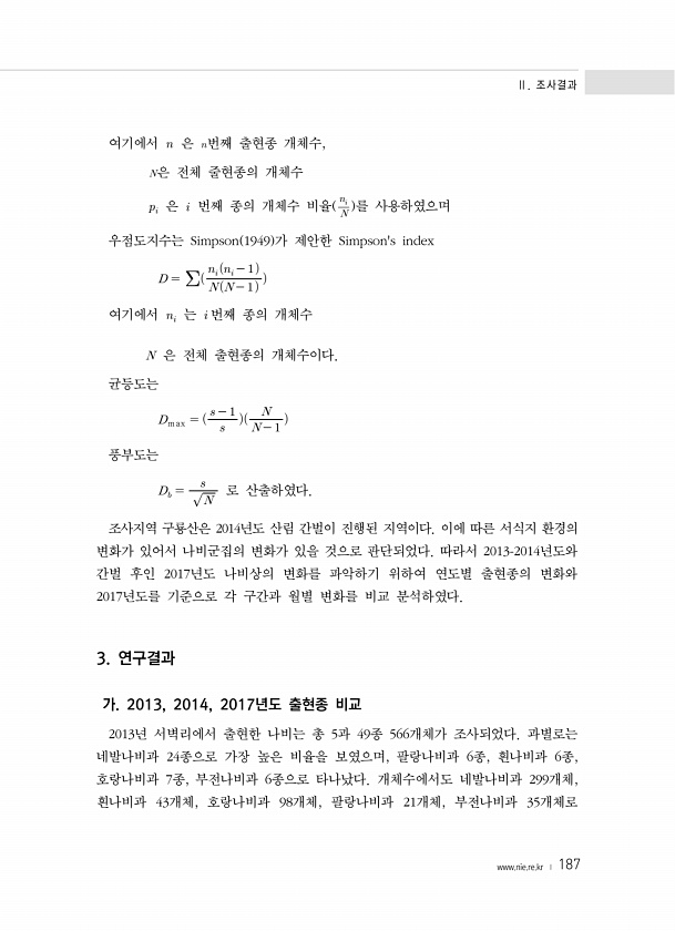 Ⅱ. 조사결과 www.nie.re.kr ? 187 여기에서 ? 은 ?번째 출현종 개체수, 은 전체 줄현종의 개체수 ?? 은 ? 번째 종의 개체수 비율 ?? 를 사용하였으며 우점도지수는 Simpson 1949 가 제안한 Simpsons index ???? 여기에서 ?? 는 ? 번째 종의 개체수 은 전체 출현종의 개체수이다. 균등도는 max ? ? 풍부도는 ? ? 로 산출하였다. 조사지역 구룡산은 2014년도 산림 간벌이 진행된 지역이다. 이에 따른 서식지 환경의 변화가 있어서 나비군집의 변화가 있을 것으로 판단되었다. 따라서 2013-2014년도와 간벌 후인 2017년도 나비상의 변화를 파악하...