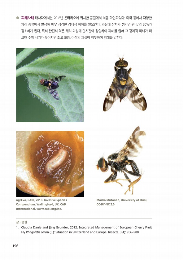 196 ● 피해사례 캐나다에서는 2016년 온타리오에 위치한 공원에서 처음 확인되었다. 미국 등에서 다양한 체리 종류에서 발생해 매우 심각한 경제적 피해를 일으킨다. 과실에 상처가 생기면 원 값의 50%가 감소하게 된다. 특히 완전히 익은 체리 과실에 단시간에 침입하여 피해를 입혀 그 경제적 피해가 더 크며 수확 시기가 늦어지면 최고 80% 이상의 과실에 침투하여 피해를 입힌다. 참고문헌 1. Claudia Danie and J?rg Grunder. 2012. Integrated Management of European Cherry Fruit Fly Rhagoletis cerasi L. Situation in Switzerland and Europe. Insects. 3 4 956?988. Marko Mut...