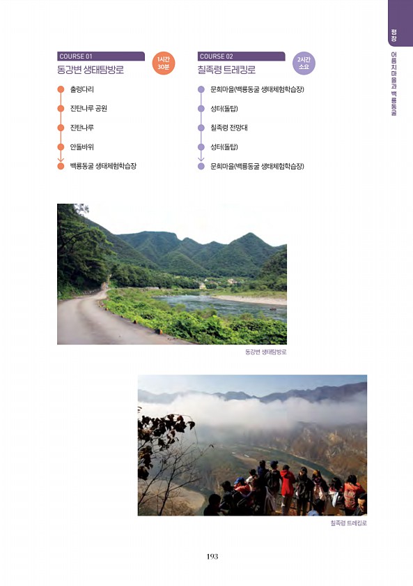 193 평창 어 어 어 어 어 어 어어 어 어 어 동강변 생태탐방로 COURSE 01 출렁다리 진탄나루 공원 진탄나루 안돌바위 백룡동굴 생태체험학습장 1시간 30분 칠족령 트레킹로 COURSE 02 문희마을 백룡동굴 생태체험학습장 성터 돌탑 칠족령 전망대 성터 돌탑 문희마을 백룡동굴 생태체험학습장 2시간 소요 동강변 생태탐방로 칠족령트레킹로