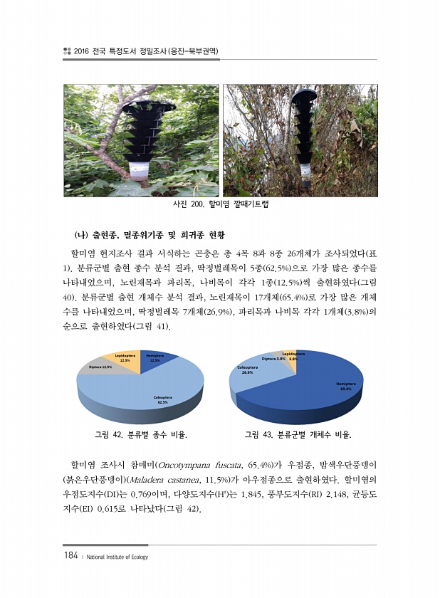 2016 전국 특정도서 정밀조사 옹진-북부권역 184 ? National Institute of Ecology 사진 200. 할미염 깔때기트랩 나 출현종, 멸종위기종 및 희귀종 현황 할미염 현지조사 결과 서식하는 곤충은 총 4목 8과 8종 26개체가 조사되었다 표 1 분류군별 출현 종수 분석 결과, 딱정벌레목이 5종 62.5% 으로 가장 많은 종수를 나타내었으며, 노린재목과 파리목, 나비목이 각각 1종 12.5% 씩 출현하였다 그림 40 분류군별 출현 개체수 분석 결과, 노린재목이 17개체 65.4% 로 가장 많은 개체 수를 나타내었으며, 딱정벌레목 7개체 26.9% , 파리목과 나비목 각각 1개체 3.8% 의 순으로 출현하였다 그림 41 그림 42. 분류별 종수 비율. 그림 43. 분류군별 개체수 비율. ...